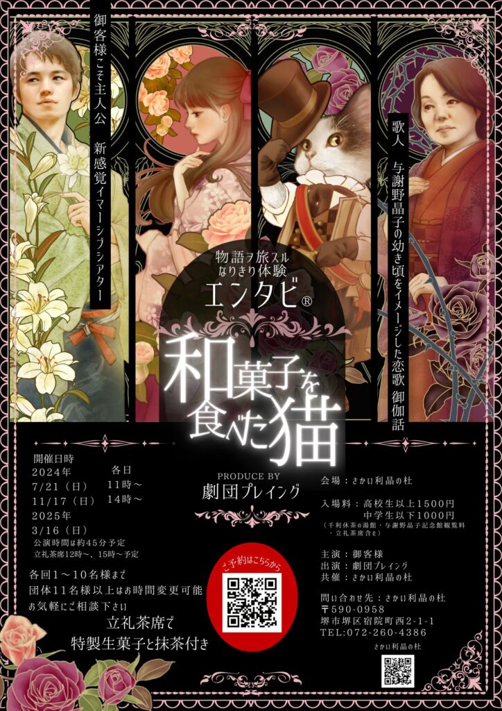 与謝野晶子の幼少期の初恋をイメージした当作品。晶子の幼少期の逸話を博物館で学芸員をされている矢内一磨氏に監修を得ながら和菓子や猫といった親しみやすいテーマを交え、歴史を楽しく学べる構成にしました。